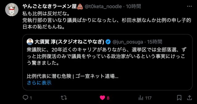 比例代表の濫用がもたらす弊害については、これから野党の状況も調べつつ、引き続き着目して行こうと思います。