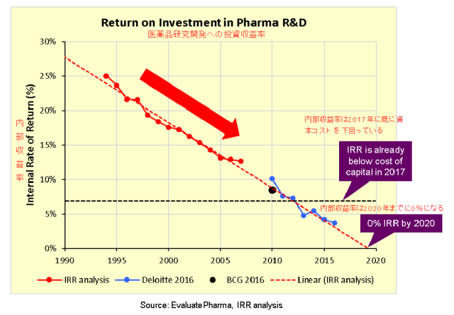 製薬会社は臨床試験コストの上昇、開発成功率の低下、ジェネリック医薬品の競争激化などの外部環境に晒されていますが、ここではそもそも創薬の投資効率は下がる一方という根本問題を提起しています。
