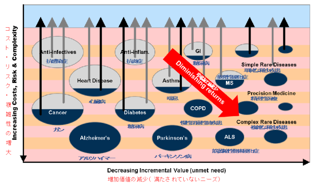 つまりリターンが大きく安くて簡単な開発領域は既に取り尽くされ、後は投資に見合わない稀少疾患だけが残っているということです。