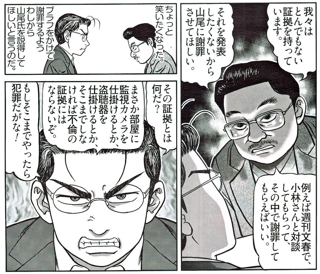 連中は決定的証拠もないまま記事を出してしまい、ありもしない「二の矢、三の矢」の記事をでっち上げるために、血眼になってよしりん先生に取材をかけ、ゴー宣道場にまでやって来て、見事に返り討ちに遭っています。