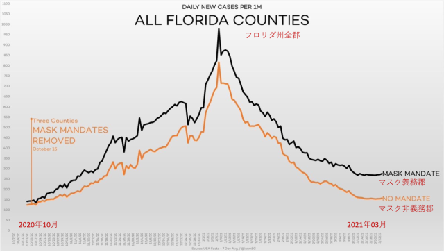 アメリカは自治体の政策に自主独立の傾向が強いため、政策と成果の違いを比較できます。ワクチン影響のない2020年、フロリダ州のマスク義務郡、非義務郡の感染者数推移を見ると、義務郡の感染者数の方が多いことが分かります。