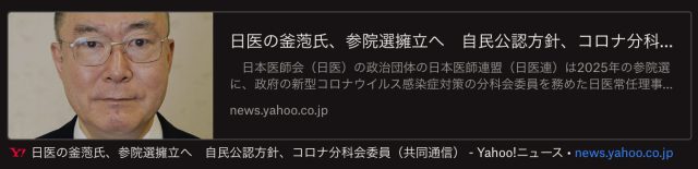 政府の新型コロナ分科会委員でもあった、日本医師会常任理事の釜萢敏氏が、2025年の参院選に自民党比例代表候補として公認申請されるという報道がありました。
