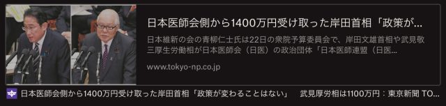 ところで、キックバック問題の大騒ぎで有耶無耶になっていますが、たった2ヶ月前の2023年11月22日には、日本医師会から岸田首相に1400万円、そして武見厚生労働大臣には1100万円の献金があった事が、国会で追求されています。