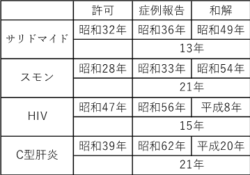 厚労省の薬害HP※①を見ると(表)、最初の症例報告から和解まで20年程度を要しています。