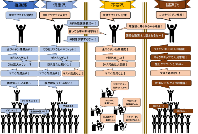 コロナワクチン反対派は実のところ三派に別れており、決して一枚岩ではありません。Twitterでプチバズった図を元に解説します。