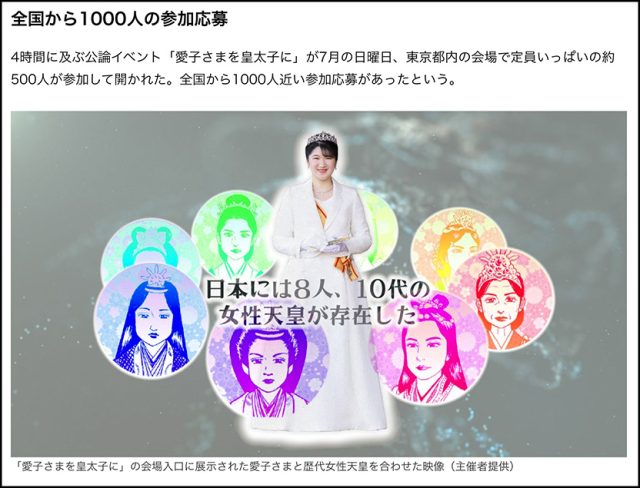 ところで、2023年7月23日に開催されたイベント「愛子さまを皇太子に」を紹介したnippon.comの記事でも紹介された、会場ロビーのプロジェクションマッピング