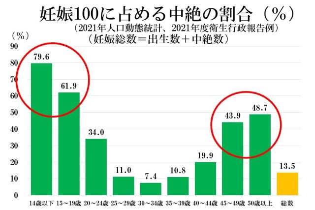 厚労省の衛生行政報告例によると、明治に作られた堕胎罪が今も存在する現代の日本でも、2021年度で年間約12万件の堕胎が行われており、多くは学生と思われる10代と、妊婦としては高齢期の予期しない妊娠と思われる40代後半~50代で高い堕胎率を示しています。
