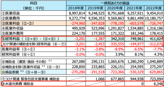 病院経営の調査には様々なものがありますが、日本病院会などによる病院経営定期調査によれば、この3年間、コロナ補助金によって利益が嵩上げされている構造が明白です※⑤。そしてコロナ補助金が大幅に減少する今、病院経営者は頭を抱えているはずで、早速昨今の水道光熱費の高騰に対しても補助金をあてがい始めました。病院というのは基本的に補助金ありきでしか成り立たない事業なのです。