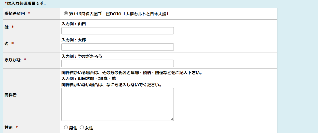 これは、応募に慣れた方にもお願いしたいことですが、入力欄のうちの「同伴者」の欄の入力についてです。お一人で参加されるというかたは何も入力せず、空欄のままにしてください。
