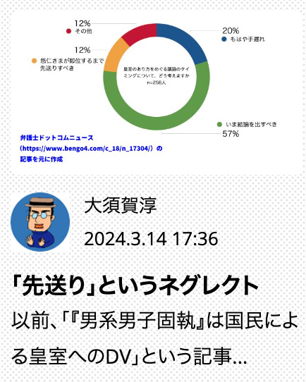 2024年3月14日に「『先送り』というネグレクト」という記事で、皇位継承問題の議論を空転させて先送りにする姿勢を、「ネグレクト」(放置による暴力)になぞらえて批判しました。