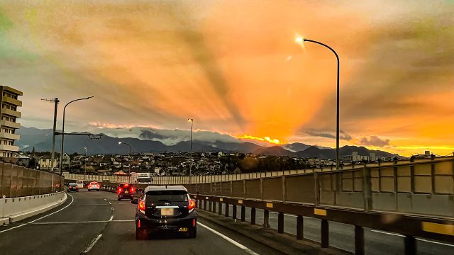 昨日(4/9)の夕刻、妻が運転する車の助手席に乗っていたら、丹沢方面に沈む夕日と雲が作り出した、文字通り「神がかった」景色を見る事ができました(写真ではこの純情な感情が1/3も伝わらない)。