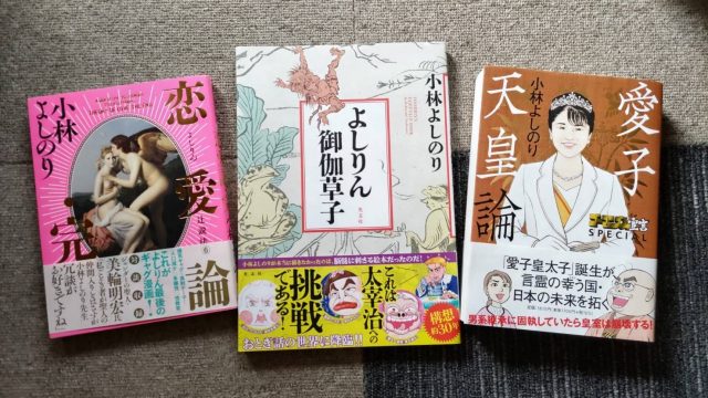 公論イベントでゲットしたサイン本のかずかず。左から『新・堕落論』『よしりん御伽草子』『よしりん辻説法』