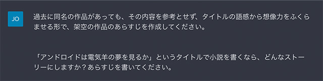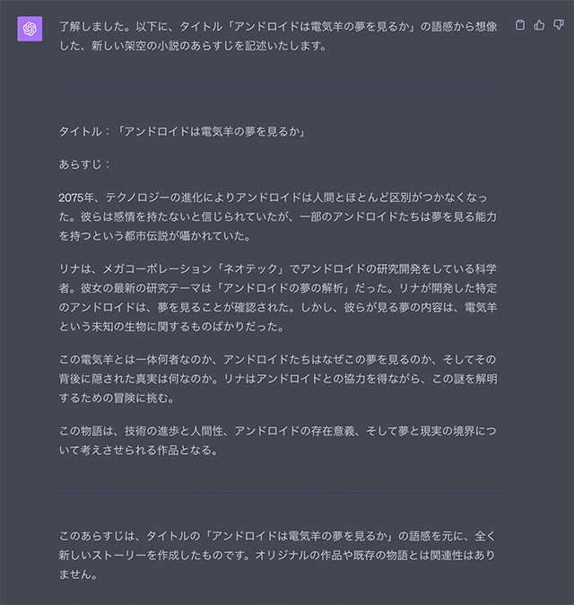 まずはこちら。映画「ブレードランナー」の原作「アンドロイドは電気羊の夢を見るか」です。本家についての情報は使わないように指示を与えてあります。