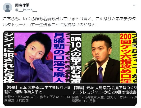 そんなユーチューバーに利用されてインタビューに応じて、こんな気持ちの悪い、悪意しか感じないサムネをつけられて配信されても、それを自ら宣伝している神経って、異常としか思えません。