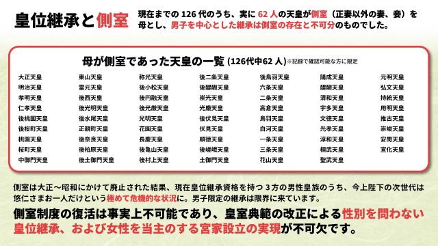 現在の一夫一婦制、および養子を禁止する状況下で、男子限定の継承に固執する事に無理があるのは明白。こうして、母が側室である方を一覧にするだけで、より明確に理解できます。