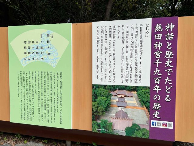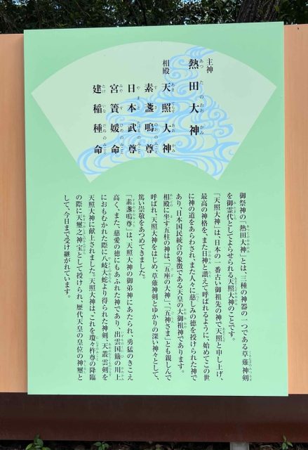 そのうちの一つの草薙の剣を祀っている熱田神宮自体が、参道の横に置いているパネルでこう説明していました。