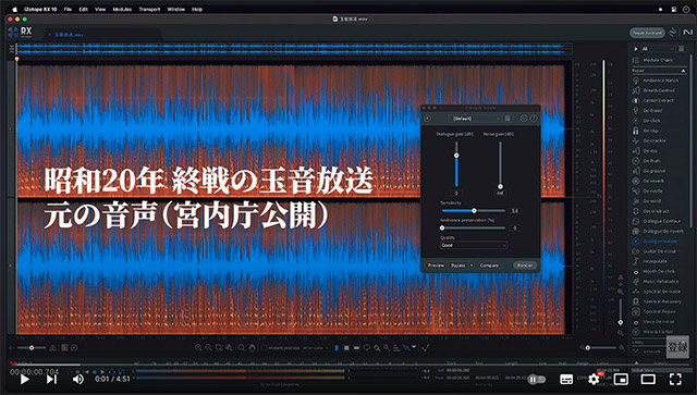 ちょっとデモとして、宮内庁が公開している、昭和20年の昭和天皇による終戦の玉音放送音声から、ノイズを取り除く動画を録ってみました。