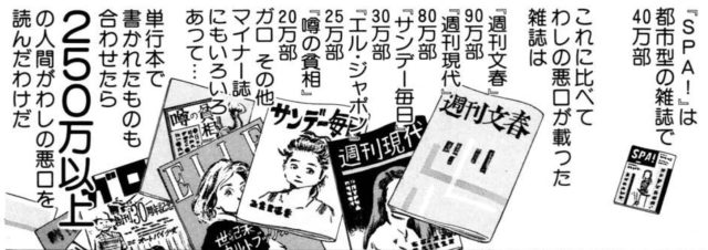 1994年の作品が載っている「ゴーマニズム宣言」7巻収録「第130章 我こそは傷つけられし者なり」中の、よしりん先生をバッシングした雑誌の部数を見ると、今では信じられない数字が並ぶと共に、「噂の〝貧相〟」のように廃刊となってしまった雑誌も混じっています(冒頭に挙げた週刊少年ジャンプも、2023年6月13日のデータで125万部と、当時の1/4にも満たない数字)。
