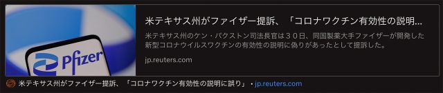 ニュースの大枠は、当初95%と説明されていたコロナワクチンの有効性が、実際には0.85%しか無く、消費者を欺くマーケティングから保護するテキサス州の法律に違反したとして、テキサス州のケン・パクストン司法長官がファイザー社を提訴したもの。