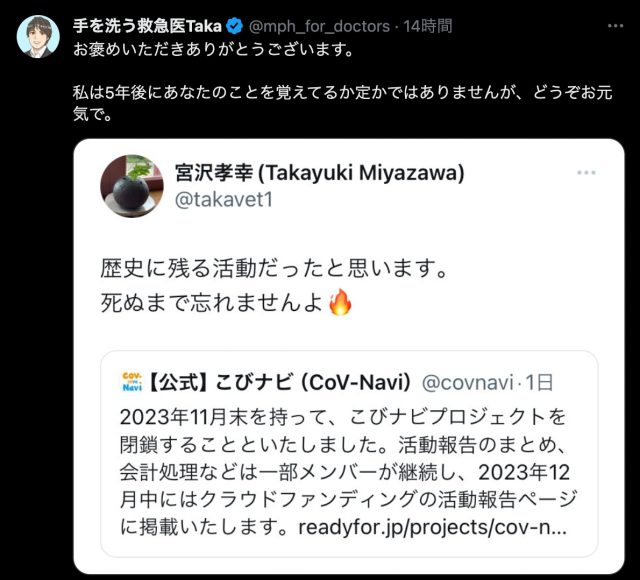 ところで、上で示したこびナビアカウントのポストを宮沢孝幸氏が引用したところ、(もう「元」?)こびナビ副代表の手を洗う救急医Takaこと木下喬弘がこのように返答しています。