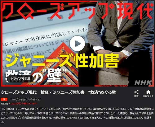 昨日のNHK「クローズアップ現代」はジャニーズ性加害問題の第3弾を放送しましたが、今回もまた酷い番組でした。