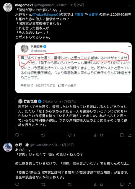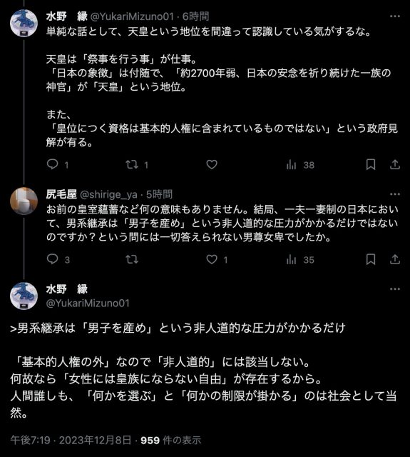 水野という人物は、法の文面で「人権」に制限がかかると解釈される皇族には「人道」に外れた行いをしても構わないと言う(上記を読んだ上で、私の受け取り方が恣意的と言うなら、いくらでも批判すれば良い)。