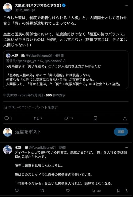 他のポストを見ても、水野が用いる言説は判で押したような百凡の「ダンケー言説」ばかりなので、論理の面でも随所で破綻しているが、この人物が「正直だな」と思った点として、「ディベート」(実際の思想に関係なく、議論を行う一種のゲーム的行為)を隠れ蓑にしつつ、自分の言説が「情」から外れたもの(その中には「人道から外れた」理屈も含まれるだろう)である事を否定していないのだ。