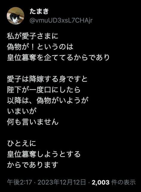 真実の追求でも何でもなく、男系男子固執が歪んだ形で表出した一形態でしか無いんですね。ただ、愛子さまに対する直接的な侮辱なので、Y染色体の話よりもはるかに悪質です。