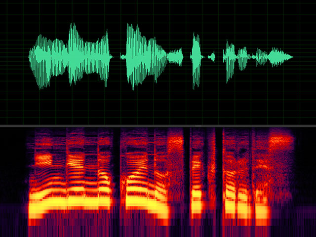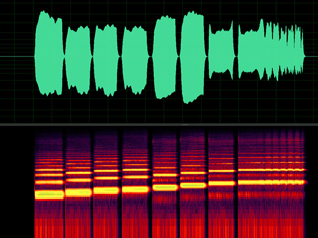 音を分析したり編集する際は、利便性から音を「視覚化」します。下記図の上が音量変化を表す「波形」、下が周波数ごとの強さを表す「スペクトログラム」(いわゆる声紋分析などにつかわれます)これは、人間の声の波形とスペクトログラムです。