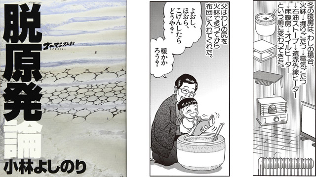 それについてはまた改めて書こうと思いますが、本書の冒頭で印象的に語られているのが、以前の作品にも登場した「2歳のよしりん先生がお父さんに火鉢であぶって暖めてもらった思い出」と、それに併せての、先生が時代と共に体験してきた暖房器具の変化の描写です。
