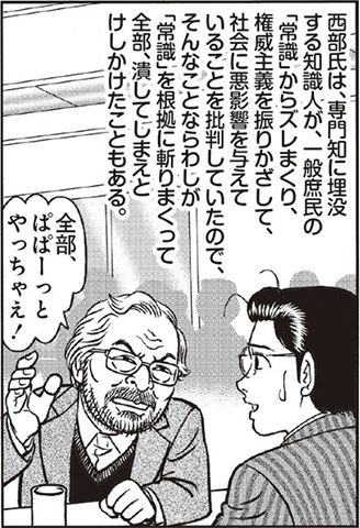 西部氏は、専門知に埋没する知識人が、一般庶民の「常識」からズレまくり、権威主義を振りかざして、社会に悪影響を与えていることを批判していたので、そんなことならわしが「常識」を根拠に斬りまくって全部、潰してしまえとけしかけたこともある。