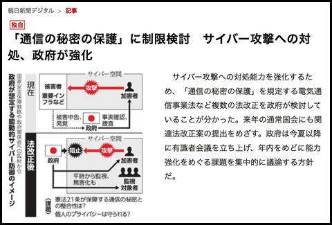 どうも最近「有識者会議」という言葉が出ると、鬼太郎の妖怪アンテナばりに警戒アンテナがピピッと立つ体質になってしまったのですが(笑)、サイバー攻撃への対策は非常に重要であると考えつつ、懸念の一番大きな要因は「憲法21条」との兼ね合いです。