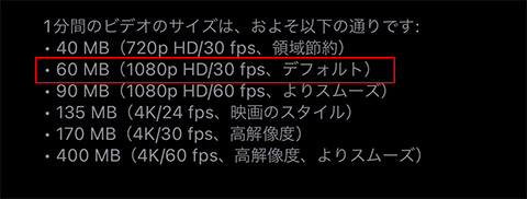 これはiPhoneの動画画質の設定画面ですが、標準の設定だと、1分間で約「60メガバイト」の容量になります。