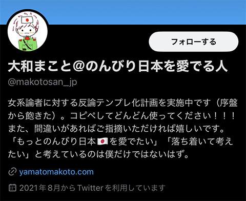 そんな中、公論戦士および近い意見の方にやたら頻繁に反応してくる「大和まこと」氏のプロフィールに