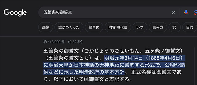 ちょっと、わかりやすい方法で調べてみましょう。下記はGoogleで「五箇条の御誓文」と検索した結果。ヒット数は約11万3000件 です。