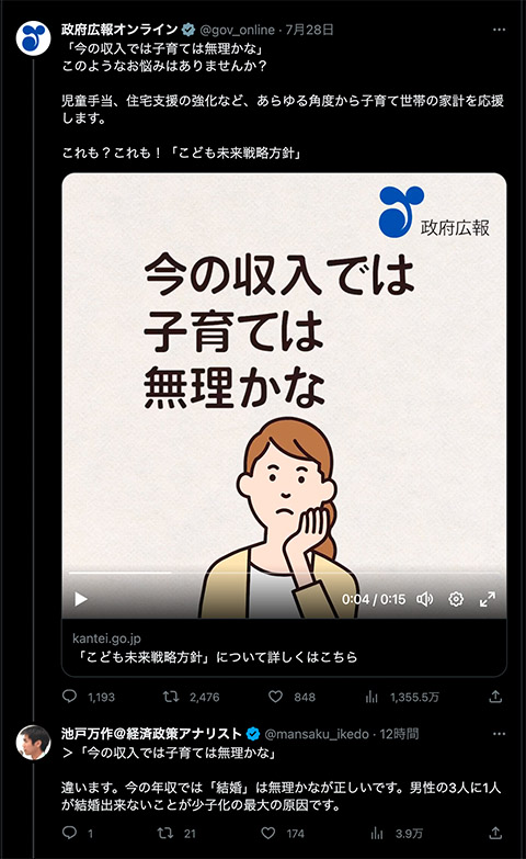 子育て世帯への支援拡充をPRするものですが、さらに前段階となる「結婚」の困難さに原因を見出す説には、一定の説得力もあると思います。