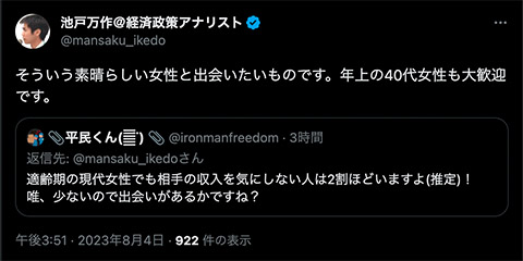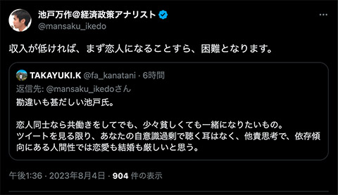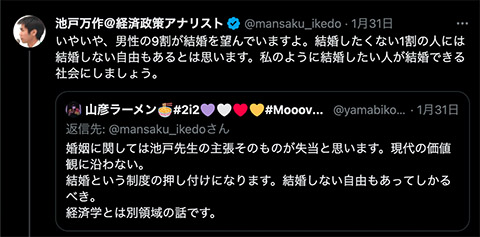 (池戸氏の実際のプライベートは存じませんが)氏は半ば自虐的なキャラ演出を含めつつ、結婚が困難な理由を社会状況に求める論を展開されていますが