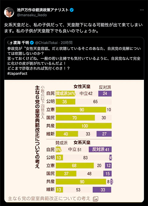 さらに補足すると、皇族には姓がないので、上記の例えが現実になった場合「池戸氏」ではなくなり「万作殿下」ですね(易姓革命で池戸王朝になる!といった誤りを騒ぎ出す人が出そうなので)。