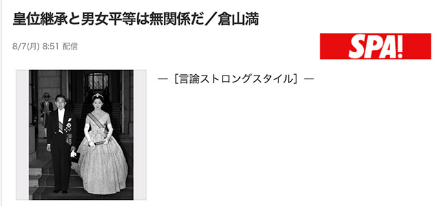SPA!2023年8月8日号に掲載され、笹さんの記事でも完膚なきまでに(笑)叩きのめされていた倉山満の「言論ストロングスタイル/皇位継承と男女平等は無関係だ」が、Yahoo!ニュースにも転載されていました。