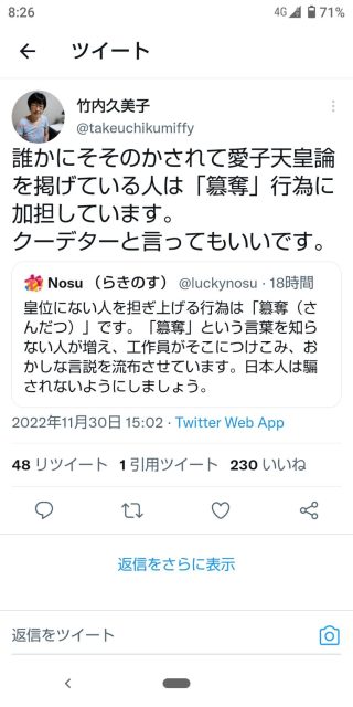 竹内久美子の昨日のデマ「愛子天皇論はクーデター」