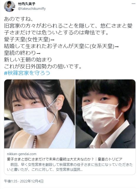 竹内久美子のデマ「愛子天皇誕生とは反日外国勢力の狙い」