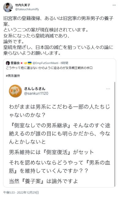 いまだに皇室の運命を未確認人物に賭けようとしている竹内。