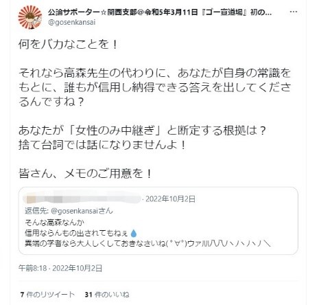 公論サポーターは、男系固執派に対し「論破祭り」を仕掛け、今も継続中です。
