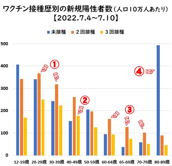 ①:20代、30代、未接種よりも2回接種のほうが、感染者数が多い!