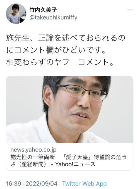 Yahoo!にもコピペ施光恒の男系カルト論が掲載されていました。