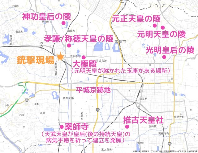 そんなことをちぇぶ司令長官に話していたら、女性天皇の御陵を地図にしたら面白いかなと思って、その時に最初の地図を作っています。
