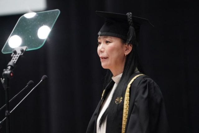 アカデミック・ドレス姿で入学式祝辞を述べる河瀨直美氏(東京大学HPより)