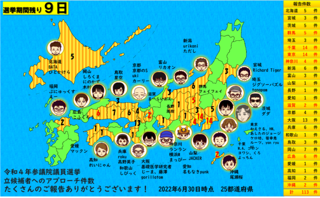 当サイトに寄せられた、参院選候補者へのアプローチのご報告件数は113件(6月30日18時半現在)。