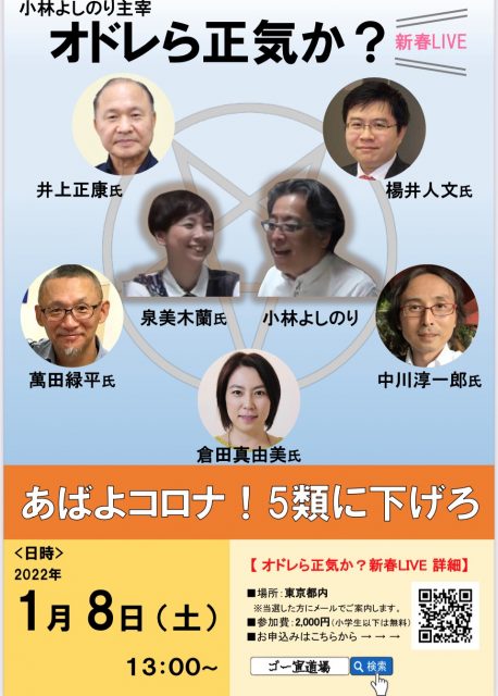 新年第一弾のテーマは「あばよコロナ!5類に下げろ」と題して、井上正康氏、中川淳一郎氏、倉田真由美氏、楊井人文氏、萬田緑平氏をゲストととしてお迎えする予定です。