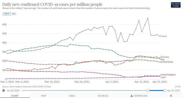 さて、ここで欧米主要国と日本における新型コロナの最近の感染状況を比較してみましょう。